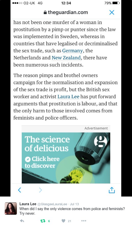‘Laura Lee has put forward arguments that prostitution is labour, and that the only harm to those involved comes from feminists and police officers.’